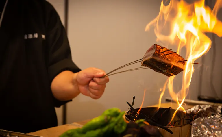 目の前で炎が立ち上る藁焼きや、備長炭でじっくり焼き上げる炭火料理。