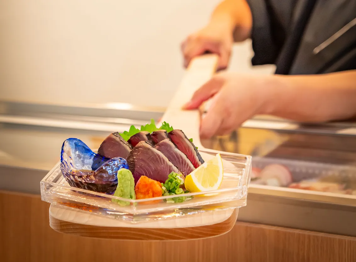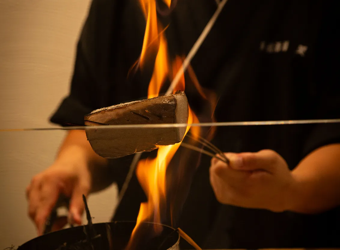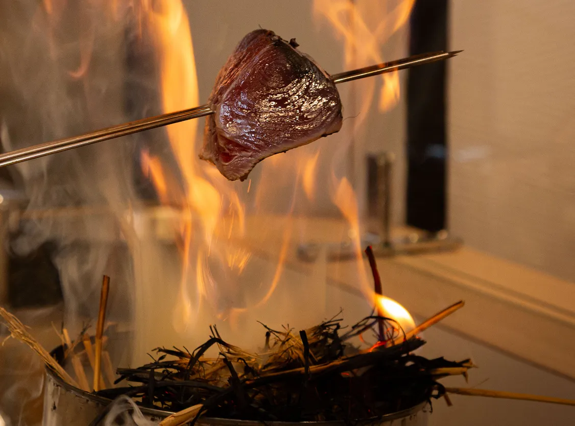 当店名物の「藁焼き」は、豪快に燃え上がる藁で一気に焼き上げることで、表面は香ばしく、中は旨みを閉じ込めた絶品の仕上がり。臨場感あふれる調理風景もぜひお楽しみください。